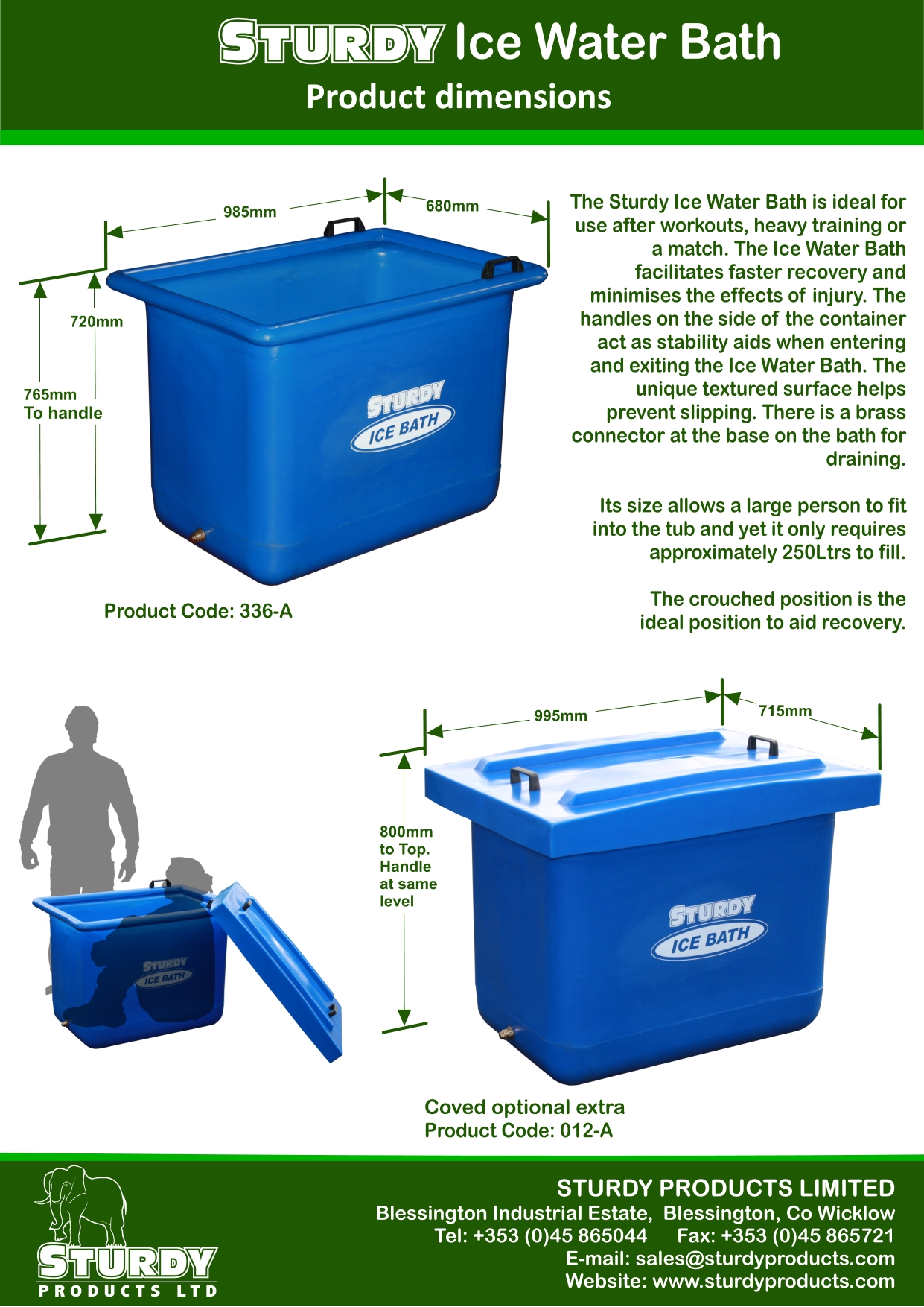 The Sturdy Ice Bath has a generous capacity of 330Ltrs, allowing a large adult to comfortably fit into the tub. When occupied it only requires approximately 250Ltrs to fill.